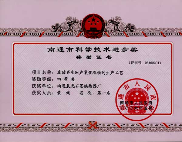 2006年5月,廢酸再生附產(chǎn)氯化亞鐵的生產(chǎn)工藝,榮獲南通市科學技術進步獎,四等獎